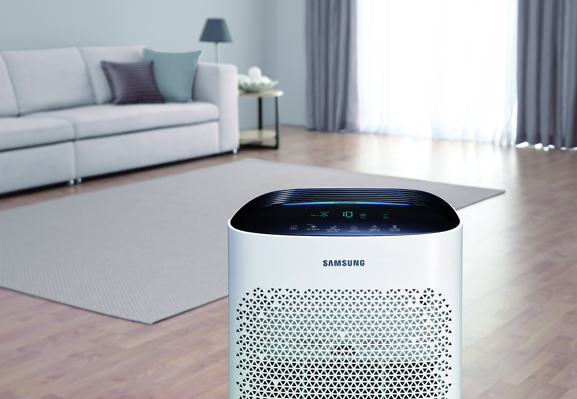 Oferują dwa tryby: automatyczny i nocny. Co ważne, oczyszczaczem Samsung możesz łatwo sterować za pomocą aplikacji SmartThings. Możesz też od razu zobaczyć, czy masz czyste powietrze. Wystarczy, że popatrzysz na jaki kolor świeci się urządzenie:- niebieski: bardzo dobra jakość powietrza,